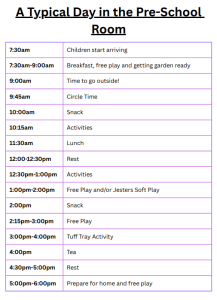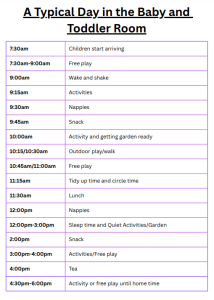 We believe routine is very important for children as it provides them with structure and they know what is happening next. This can be particularly important for some children. We also know that sometimes the routine cannot always be followed so we allow for changes where necessary and can sometimes make changes to be similar to what you do at home. For example if a child usually sleeps before lunch time at 11:30am, this is something we would fit into their routine.